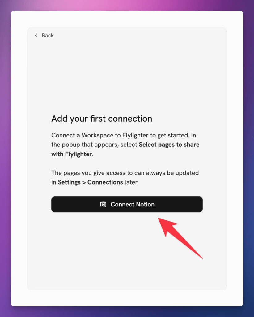 This process will securely authenticate Flylighter with your Notion workspace via the Notion API. To get started, click Connect Notion.