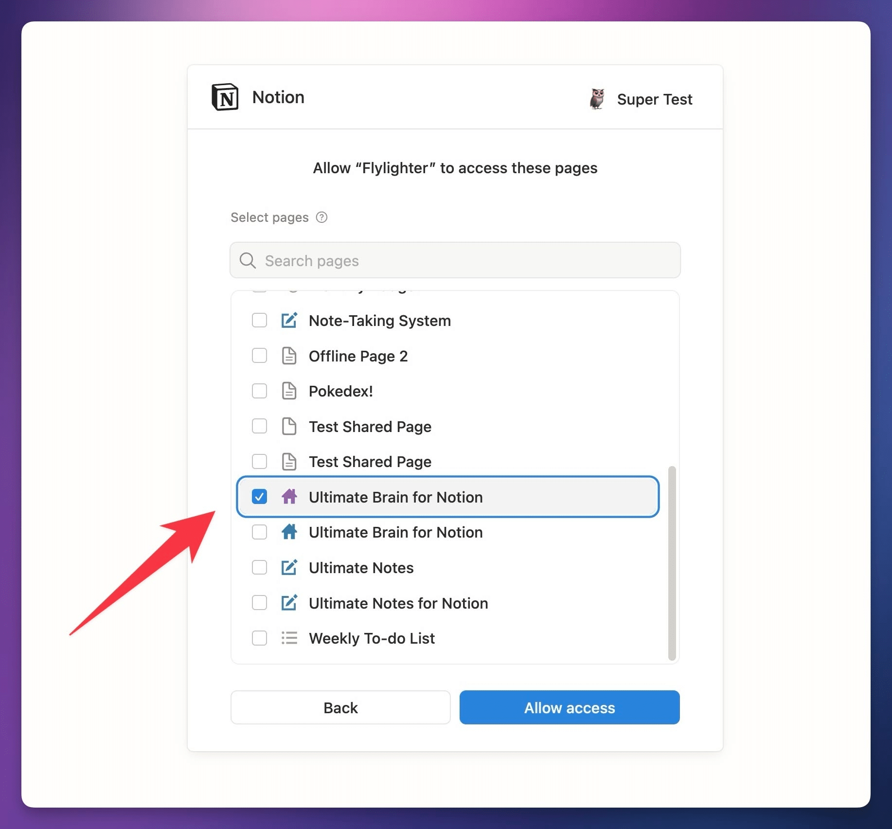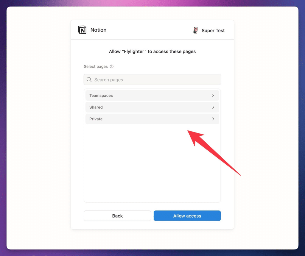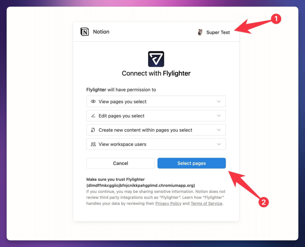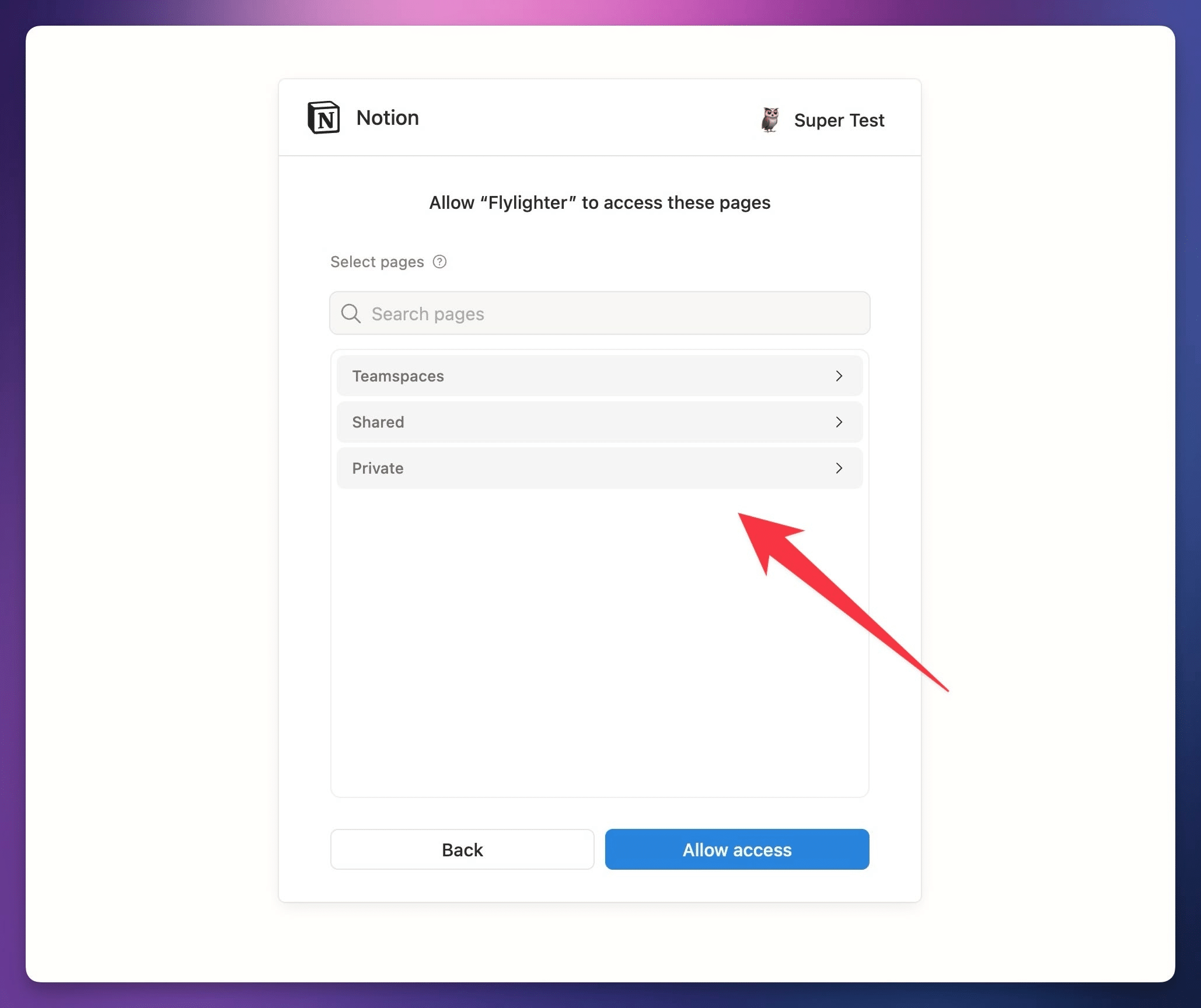 Note that if you grant access to a parent page, Flylighter will get access to any pages or databases within it (its child pages).