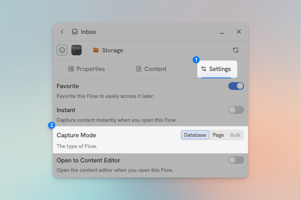 Database capture is the default mode for Flows. Each capture is added as a new page in a database.