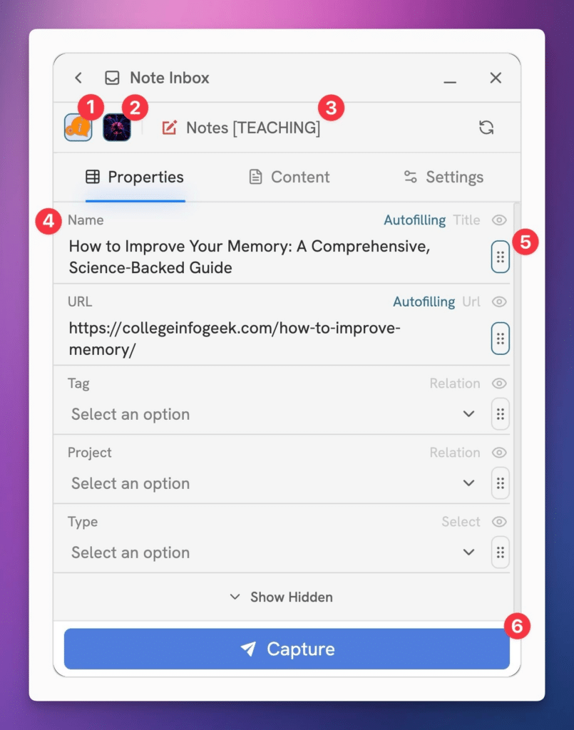 Once you’ve set your properties the way you want them, you can hit Capture to run your Flow and capture the current page to Notion.