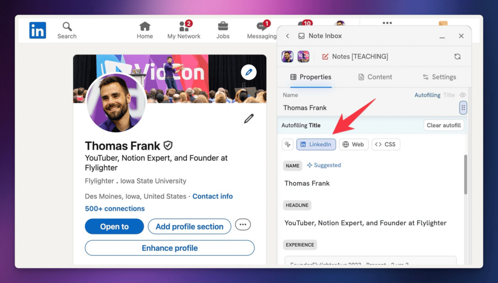 By the way, Flylighter will surface special details on specific sites, like LinkedIn, YouTube, and X/Twitter. On these sites, you’ll see a site-specific tab in the Data Picker. On LinkedIn, for example, you can capture a person’s name, headline, location, and other details – perfect for CRM workflows.