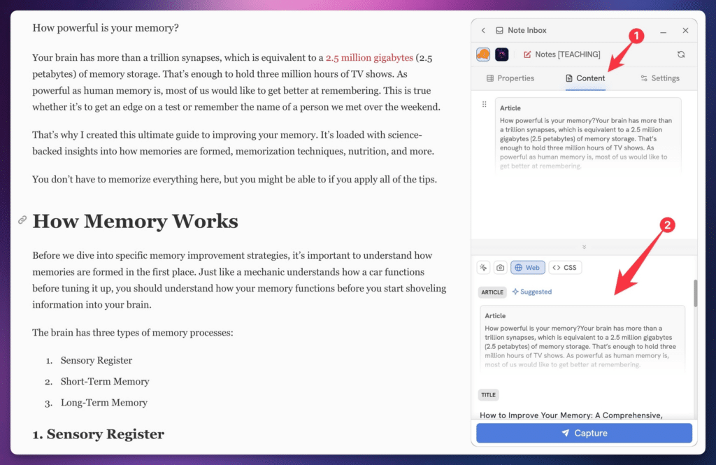 Article is a special data item that parses the entire article on the page using our custom web parser. Once you hit Capture, our parser will turn the entire article into Notion blocks.