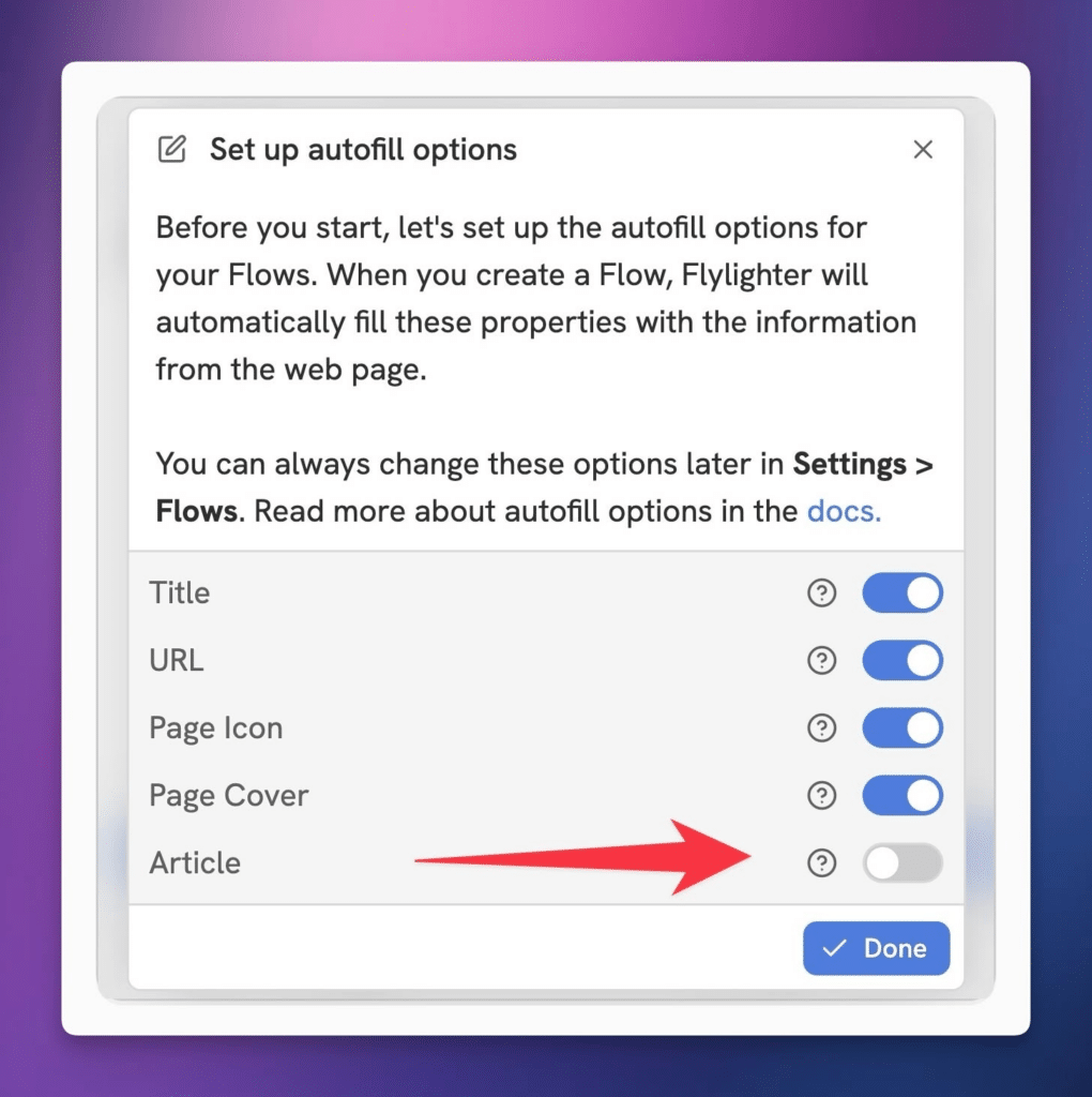 By default, Flylighter will attempt to autofill the Title property, a URL property (if your database has one), the page icon, and the page cover.