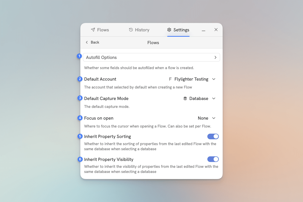 General configuration for Flows. These settings apply to all Flows, for individual Flow settings, see Flow Settings.
