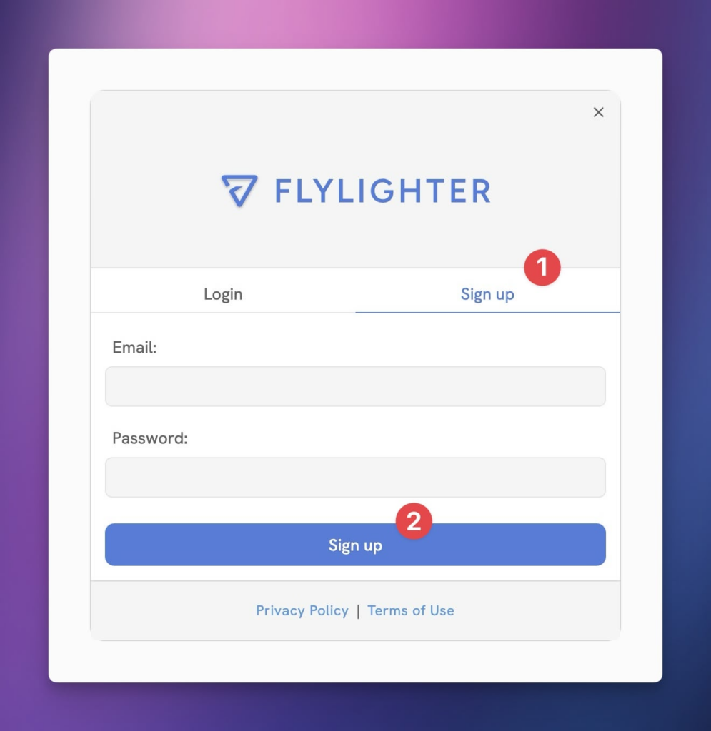 When you first open Flylighter, you’ll be prompted to log in or sign up.