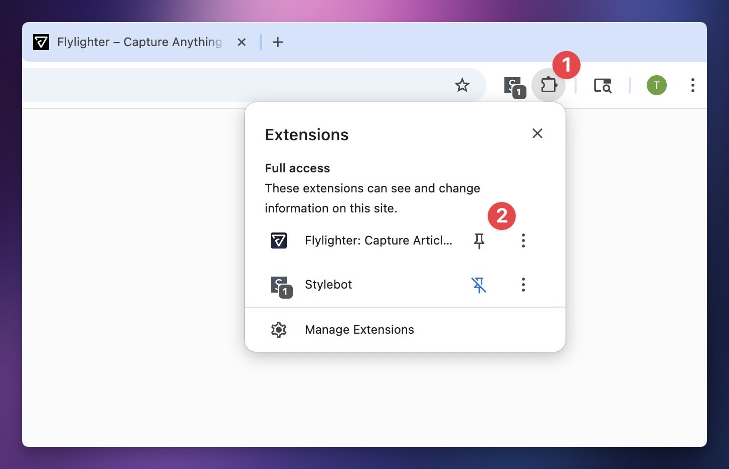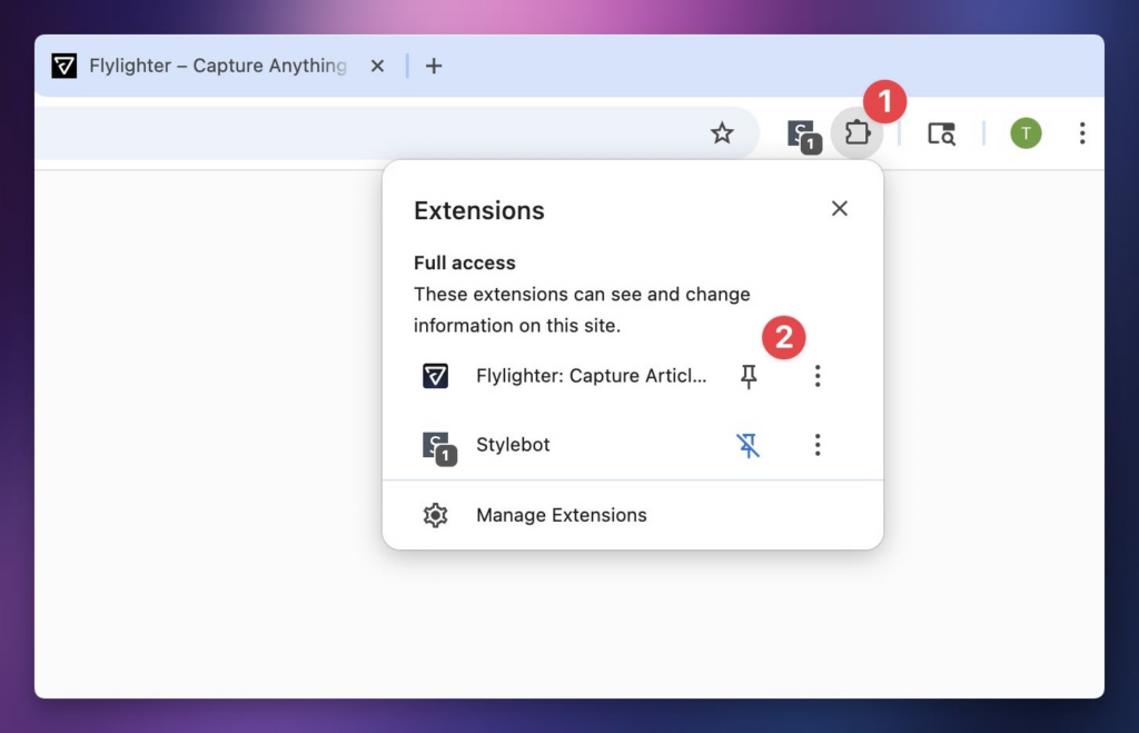 Once you’ve installed Flylighter, you may want to also pin it in your browser’s toolbar by clicking the puzzle piece icon, then clicking the icon next to the Flylighter entry: