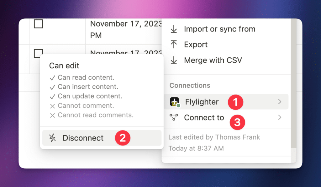 Navigate to the page or database you’re want to use in Flylighter. Click the ••• menu at the top-right of the page, then navigate to the Connections section.