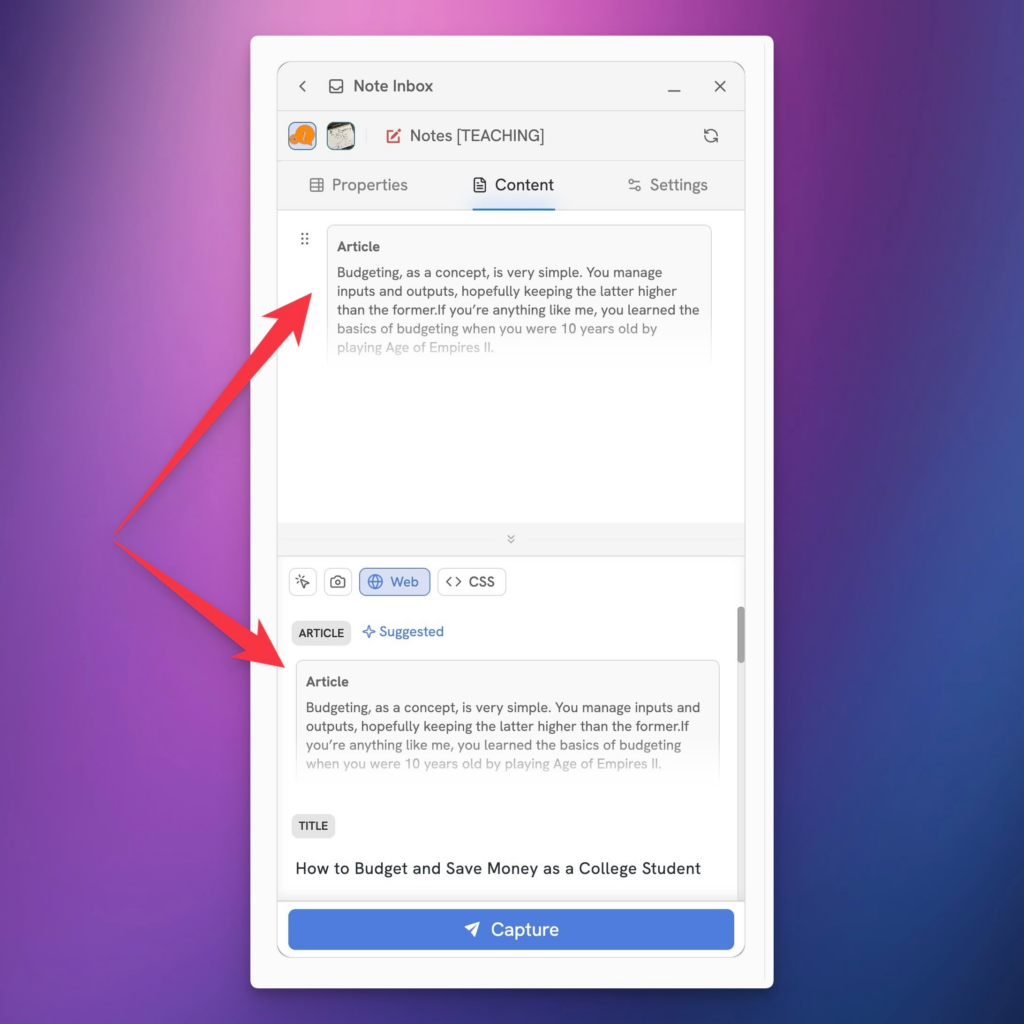 Click it, and you’ll see Article come in as a block. Once you hit Capture, Flylighter will parse the entire article and capture it to Notion.