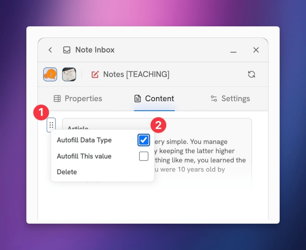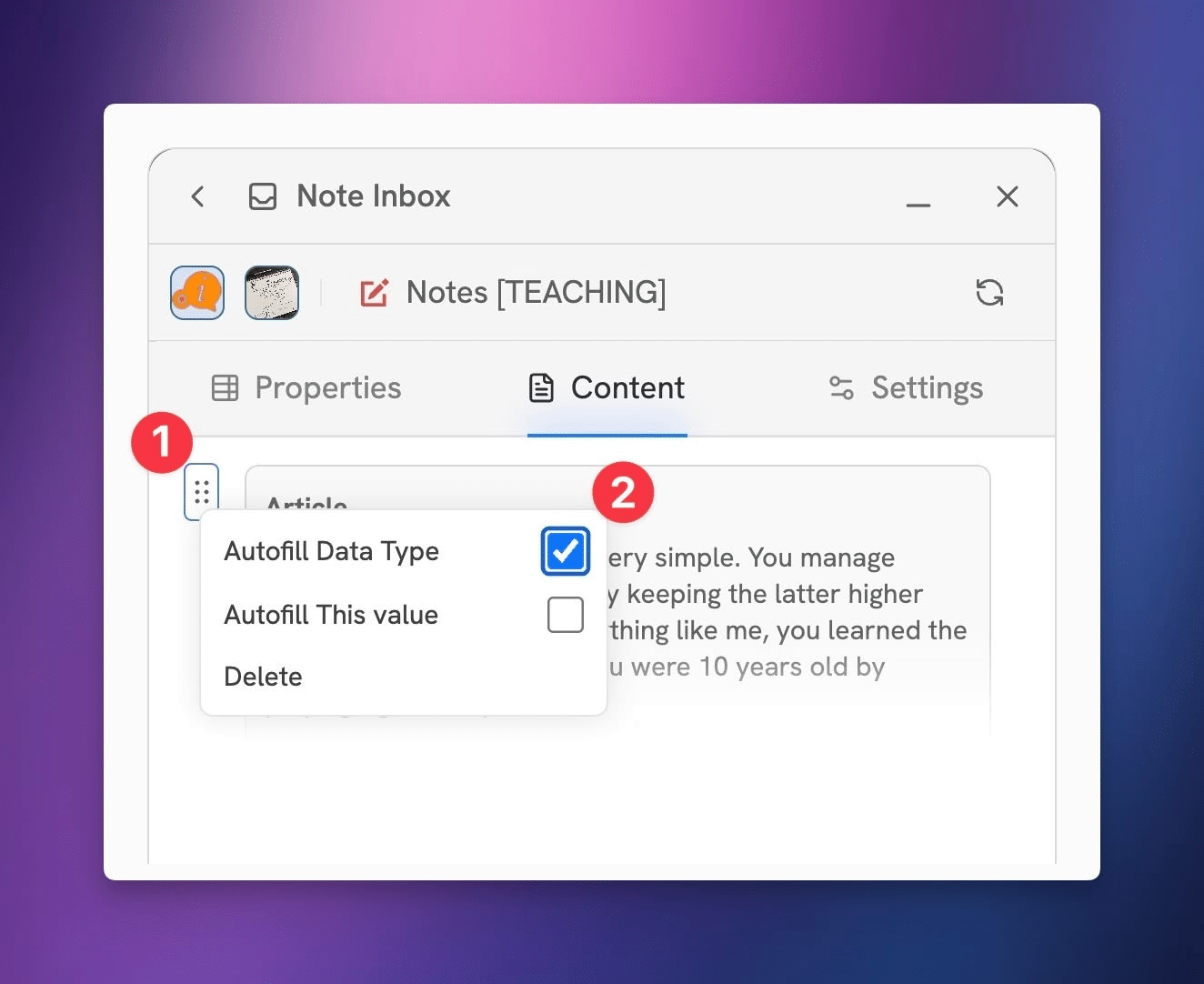 For dynamic data types from the Data Picker, such as the Article data type, you’ll likely want to choose Autofill Data Type. This treats the block as a variable. In the case of Article, it’ll dynamically parse and capture the article on the page.