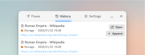 Under the History tab in the main view, you can view all the captures you’ve made, including a link the site you were on, a link to the captured content, and the option to append new content to the original.